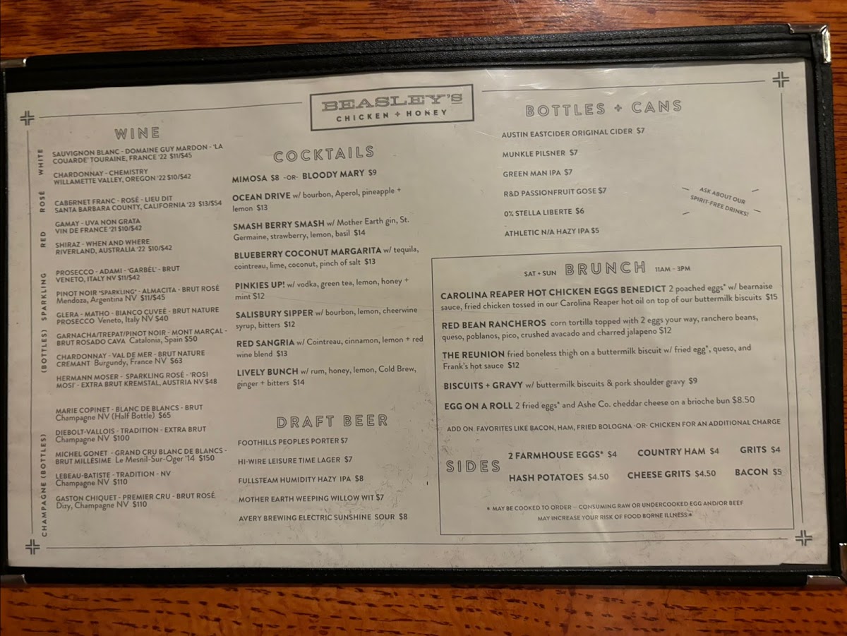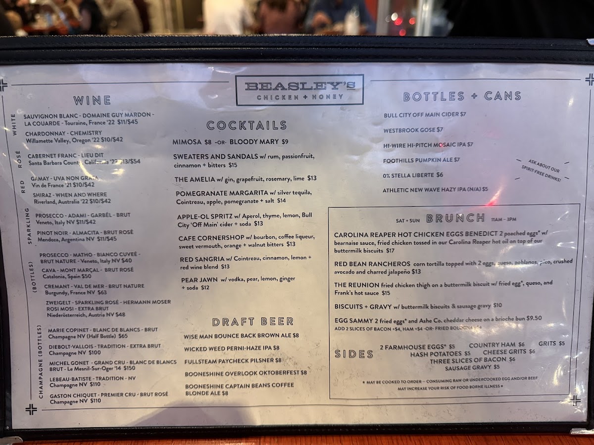Fried boneless chicken thigh on a buttermilk biscuit, topped with a fried egg, queso and topped w/ a dash of Tabasco. Allergies: Gluten, Dairy, Soy